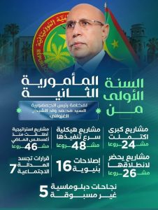 كشفت حصيلة العمل خلال السنة الأولى من مأمورية رئيس الجمهورية محمد ولد الشيخ الغزواني نسب إنجاز متقدمة لعشرات المشاريع الهيكلية التي تمت تسريع وتيرة الأشغال، وذلك بالتزامن مع إكمال أكثر من 20 مشروعا كبيرا خلال نفس الفترة.