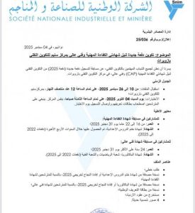 أعلنت الشركة الوطنية للصناعة والمناجم ” اسنيم ” عن تكوين دفعة جديدة لنيل شهادتي الكفاءة المهنية وفني عالي بمركز اسنيم للتكوين التقني بازويرات .