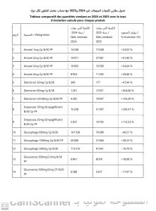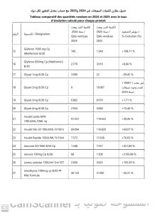 وتُظهر البيانات الرسمية لمبيعات وتوزيع أدوية الأمراض المزمنة خلال سنتي 2024 و2025 تحسنا ملحوظا في تموين غالبية هذه الأدوية (انظر الملف المرفق)، خاصة أدوية السكري والأنسولين، حيث سُجلت زيادات معتبرة في كميات عدد من الأصناف الأساسية، بما في ذلك الأدوية الفموية الحديثة والأنسولين بمختلف أشكاله.